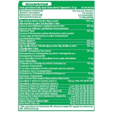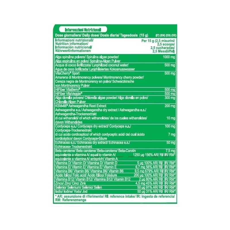 agente de carga: isomaltosa; talo (unicelular) de alga espirulina (Spirulina platensis (Gomont) Geitler) en polvo, agua de coco liofilizada (procedente del fruto de Cocos nucifera L.), VitaCherry® Sport (cereza negra Montmorency (Prunus cerasus L. ) mezcla de polvos vegetales HiFiber VitaBerry® (fruta y verdura en proporciones variables: fruta de manzana, fruta de fresa, fruta de cereza, fruta de mora, fruta de arándano, fruta de frambuesa, fruta de plátano, semilla de arroz), mezcla de polvos vegetales HiFiber VitaVeggie® (fruta y semilla), en proporciones variables fruto de manzana, raíz de remolacha, partes aéreas de brécol vegetal, raíz de zanahoria, hojas de espinaca, fruto de tomate, fruto de pimiento dulce, brotes comestibles de coles de Bruselas, raíz de jengibre, bulbo de ajo, bulbo de cebolla hojas de perejil, partes aéreas de coliflor, hojas de col, hojas de col rizada, frutos de pepino, hojas de apio, raíz de espárrago), aromas, polvo de talo (unicelular) de alga chlorella (Chlorella vulgaris Beijerinck), acidulante ácido cítrico; antiaglomerantes: talco, dióxido de silicio; ® KSM-66 Extracto de raíz de ashwagandha (contiene LECHE) [extracto seco de raíz de ashwagandha (Withania somnifera (L. ) Dunal) tit. 5% withanolides], extracto seco de cordyceps (Cordyceps sinensis (Berck.) Sacc.) esporóforo 7% ácido cordicéptico, edulcorante: glicósidos de esteviol; extracto seco de equinácea (Echinacea angustifolia DC. ), gluconato de zinc, acetato de D-alfa tocoferilo (vitamina E), clorhidrato de piridoxina (vitamina B6), L-selenometionina, betacaroteno (vitamina A), colecalciferol (vitamina D), cianocobalamina (vitamina B12), ácido pteroilmonoglutámico (ácido fólico), yoduro de potasio.